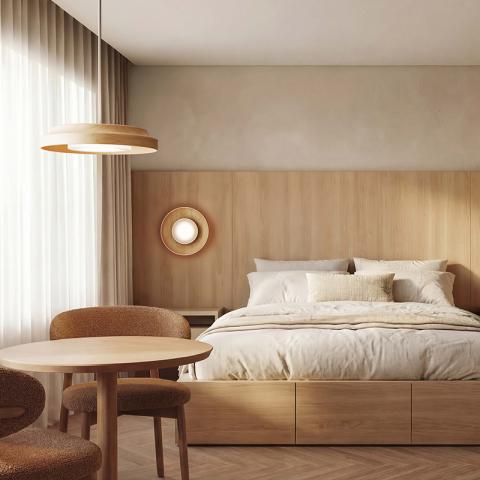Torno features circular, flat shades measuring 14 inches in diameter and 2.6 inches high. Each shade is partially handcrafted and offered in three ceramic finishes—Ivory White, Coal Black, and Terracotta Brown—and two locally sourced wood finishes, maple and oak. Because each shade is made with natural materials and refined by hand, subtle variations make every piece unique.