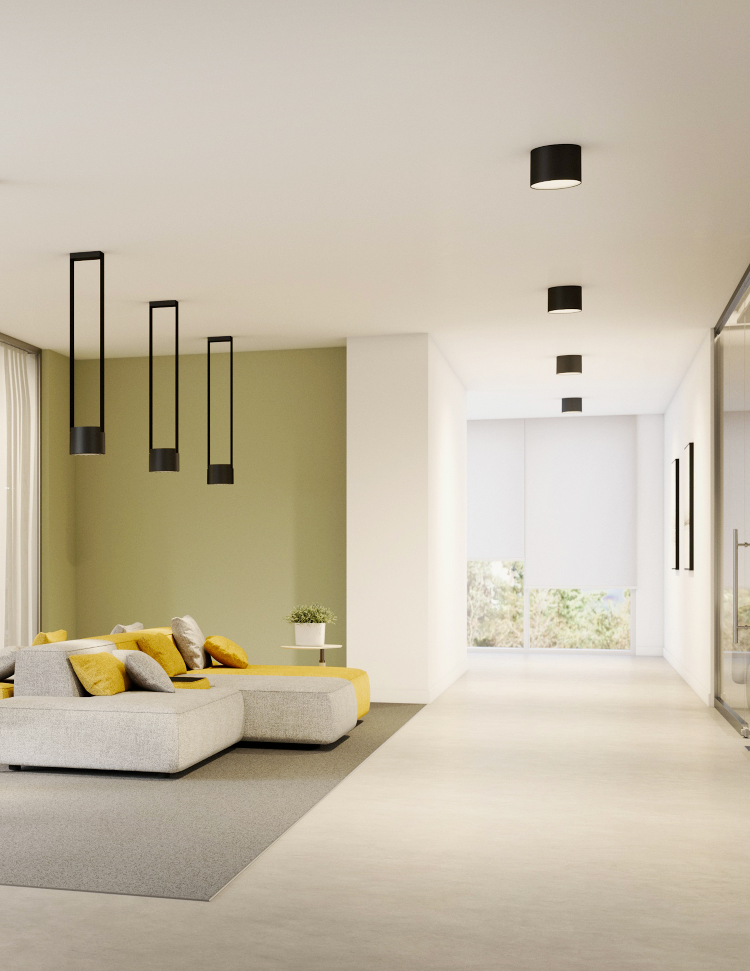 Le luminaire est installé au plafond à l'aide d'un système de montage de surface dissimulé, ne laissant aucun mécanisme visible.