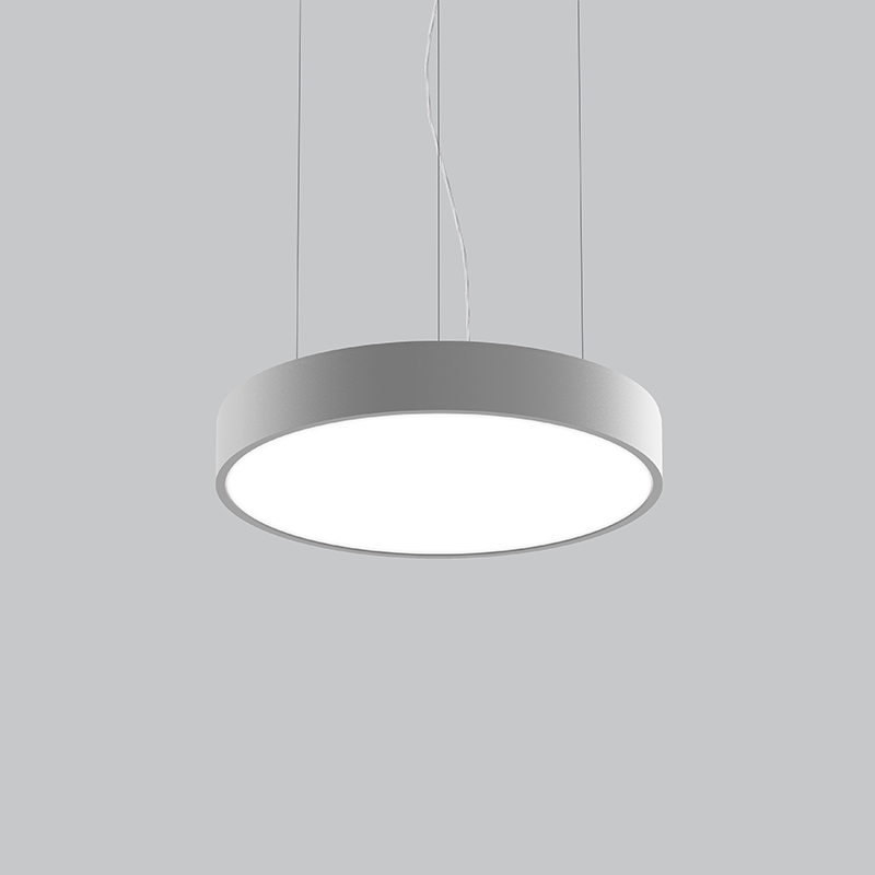 Suspension ronde, élégante et fonctionnelle disponible en grands formats de 24” et 36” avec éclairage direct. Module optionel d'éclairage indirect.