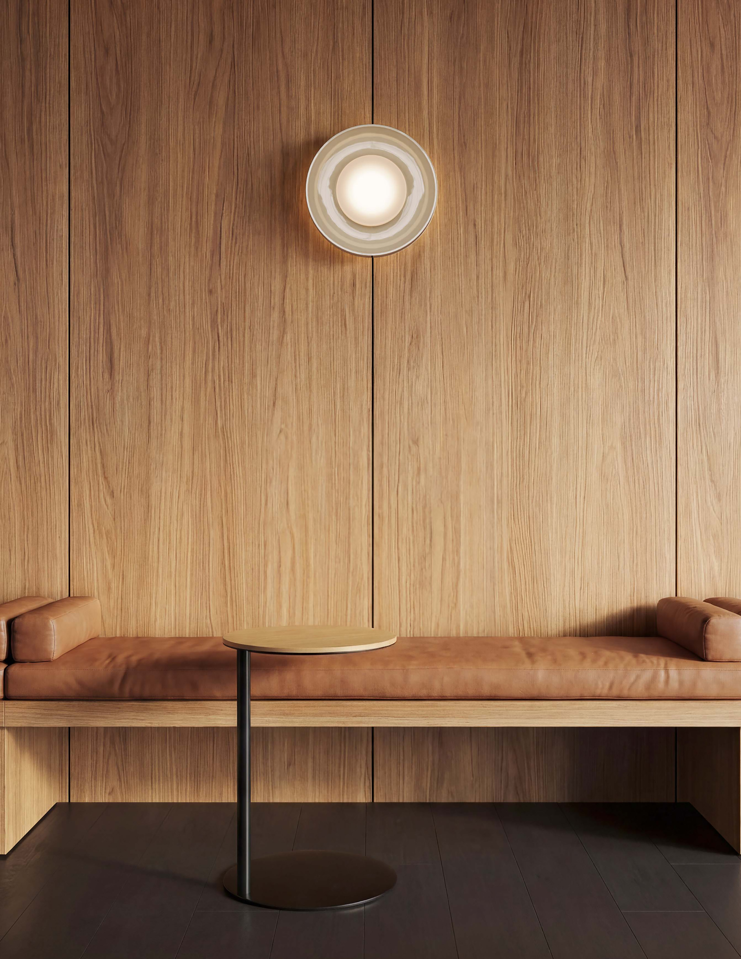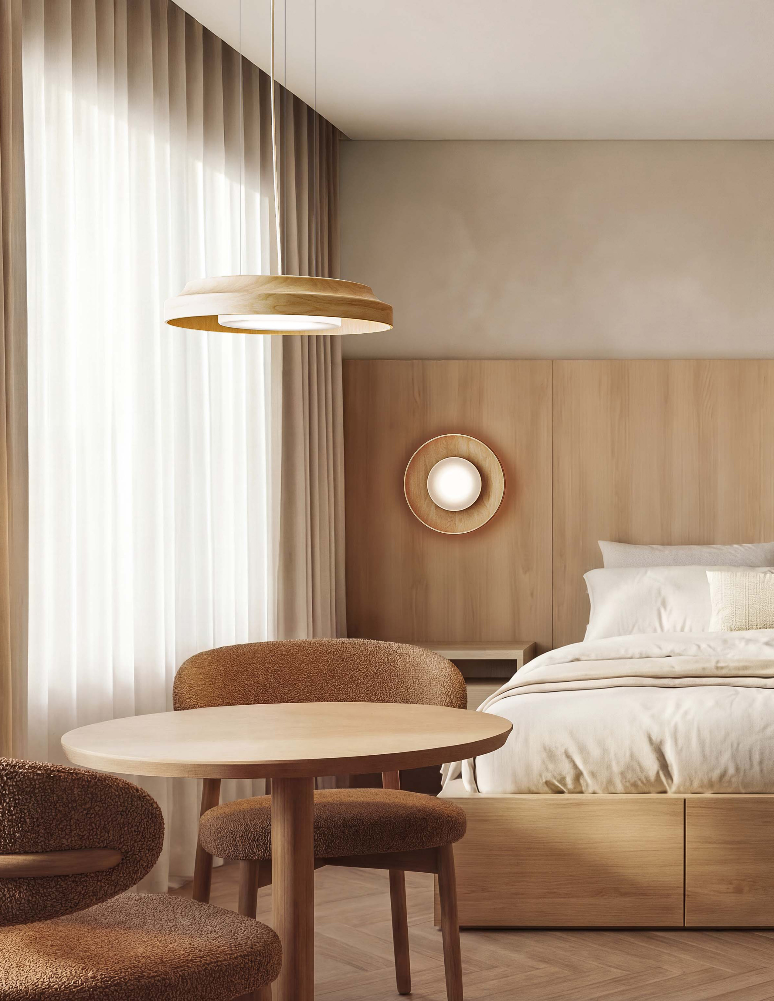 Torno’s design showcases the way light elevates material. Its 14‑inch ceramic or wood shade reveals the natural beauty and character of each, giving the luminaire a presence that feels both sculptural and organic. The pendant family is vertically scalable, allowing shades to be stacked, creating a layered composition with a soft interplay of light that enhances its visual expression.